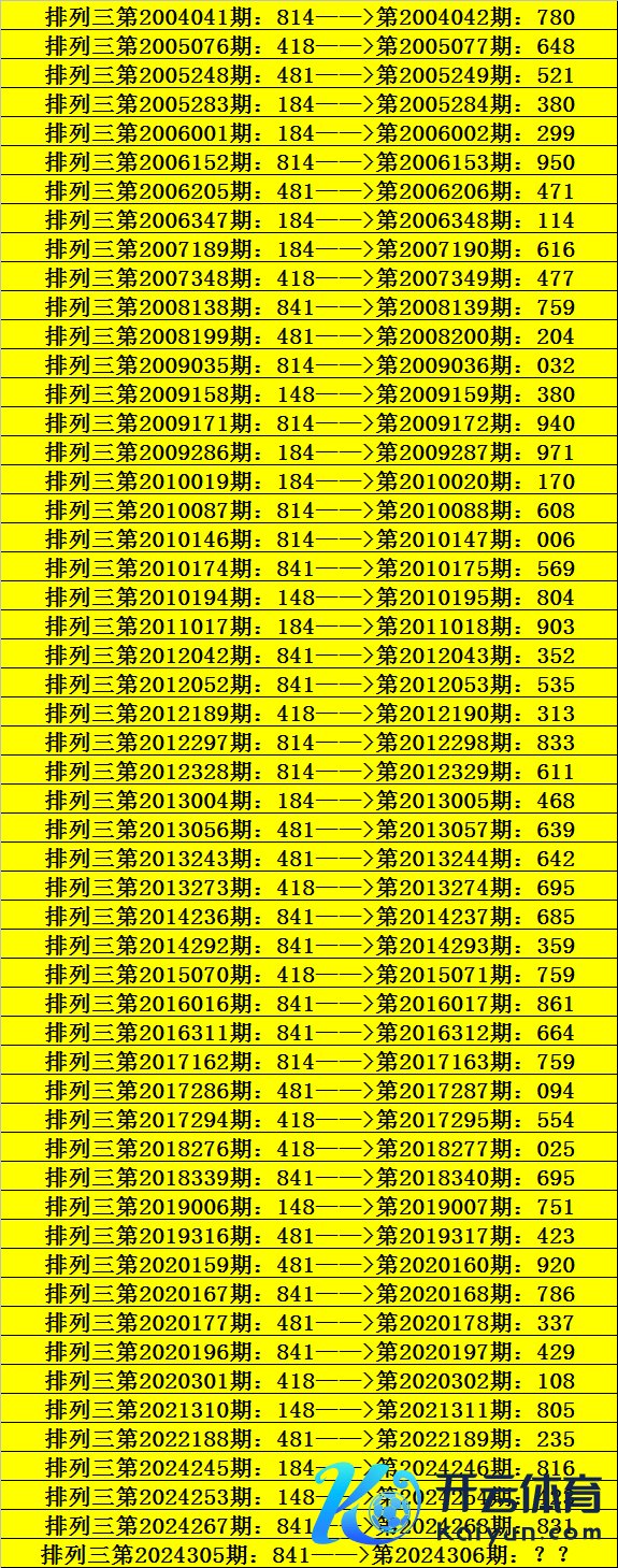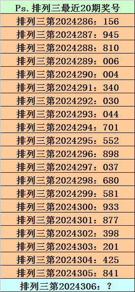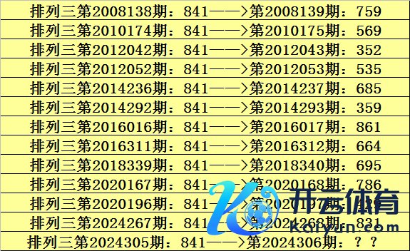 第2024305期成列三奖号为841,历史上该号码直选出现13次,下期奖号永诀为:759、569、352、535、685、359、861、664、695、786、429、831。