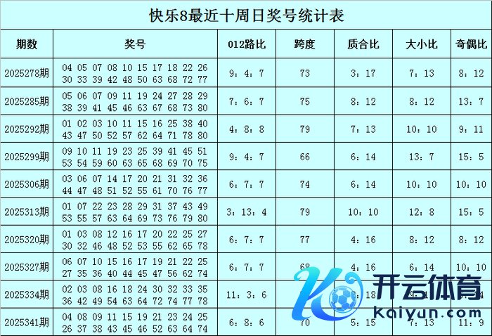 福彩快意8第2025341期(上周日)开奖回来:04 08 09 11 15 19 21 23 24 25 26 37 38 43 45 46 52 63 64 74,其中奖号012路比为6:8:6,跨度为70,质合比为5:15,大小比为7:13,奇偶比为11:9。