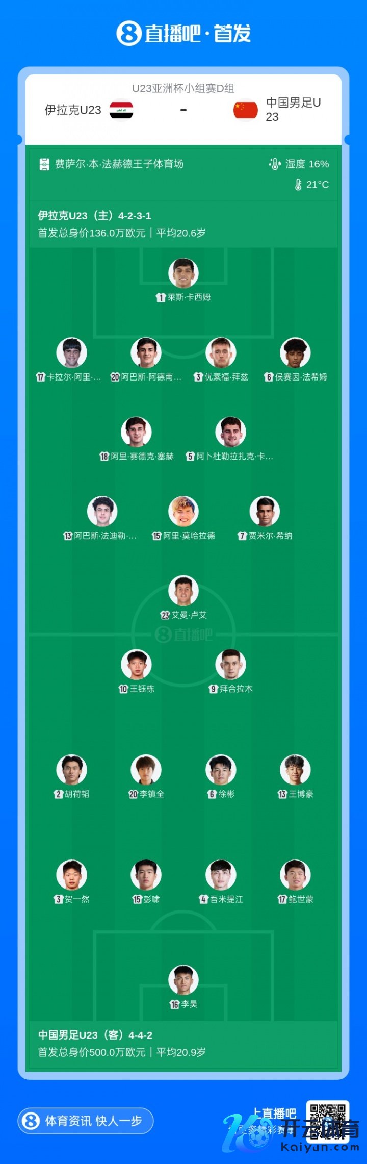 U23国足首发:16-李昊、2-胡荷韬、3-贺一然、4-吾米提江、15-彭啸、17-鲍世蒙、6-徐彬、13-王博豪、20-李镇全、9-拜合拉木、10-王钰栋