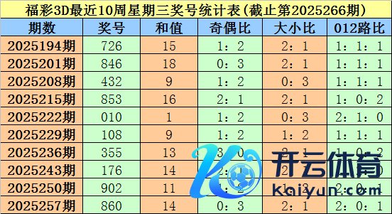 福彩3D第2025257期(上周星期三)奖号为860。其中奖号奇偶比为0:3,大小比为2:1,012路比为2:0:1。