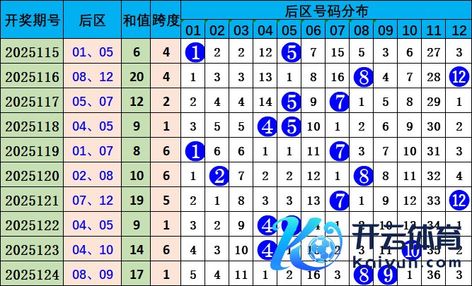 上期后区开出:08 09。和值为17,较上一期高潮;跨度为1,较上一期着落。本期瞻望和值着落,保举和值9;跨度不变,保举跨度为1。本期后区保举:04 05。