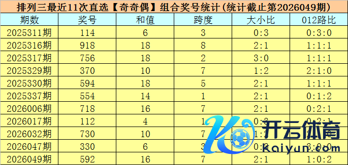 开奖归来:陈列三第2026049期开出奖号:592,类型为组六,和值为16,奇偶比为2:1,大小比为2:1,跨度为7。