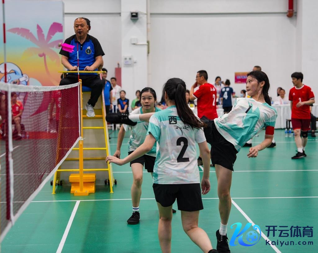 11月24日,西藏队球员朱莉玲(右一)在第十二届寰宇少数民族传统体育畅通会毽球女子三东说念主小组赛中首要。新华社记者 晋好意思多吉 摄