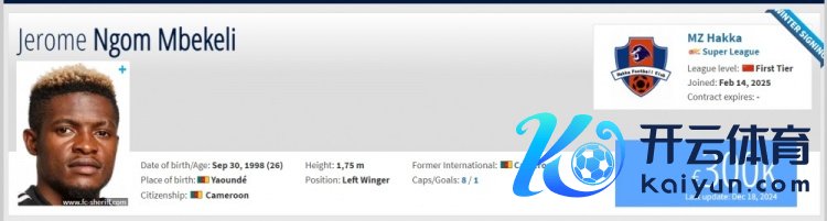 喀麦隆球员热罗姆·恩戈姆·姆贝凯利(Jerome Ngom Mbekeli)转会梅州客家。恩戈姆本年26岁,司职边锋体育赛事直播,曾入选喀麦隆国度队。此前在摩尔多瓦警长队服从,为该队出场了42次,打进6球。