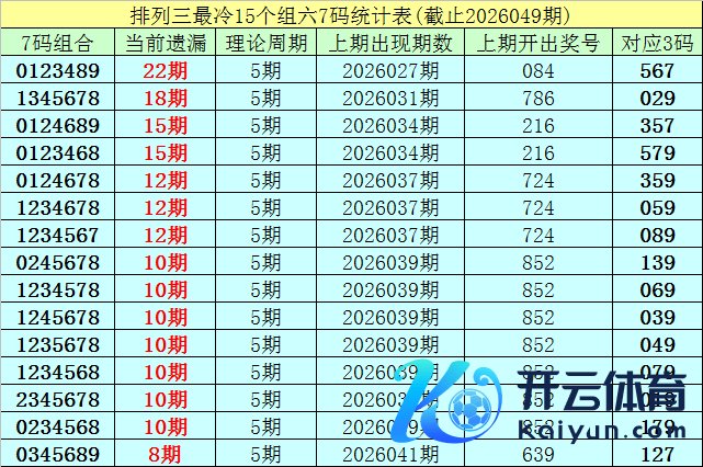 (1)在摆设三已开出的7524期奖号中(统计完了第2026049期),现在7码组六遗漏值最大的组合为:0123489,本期遗漏22期;